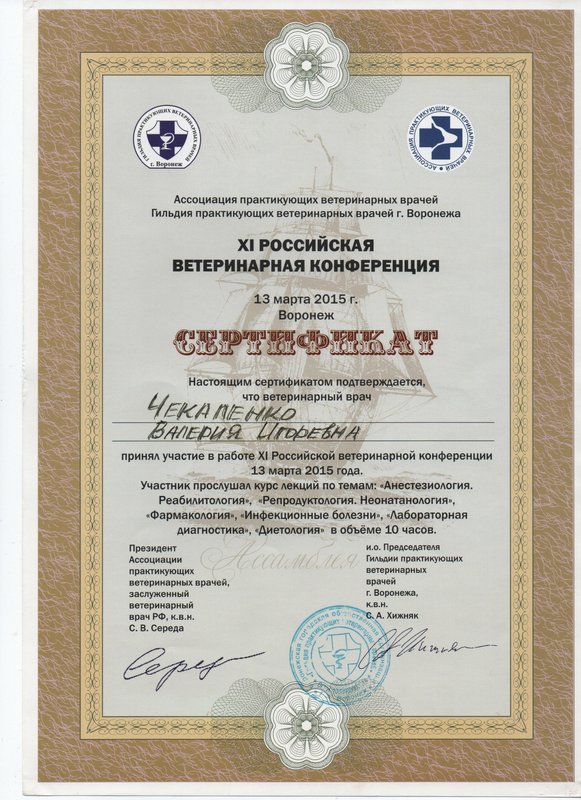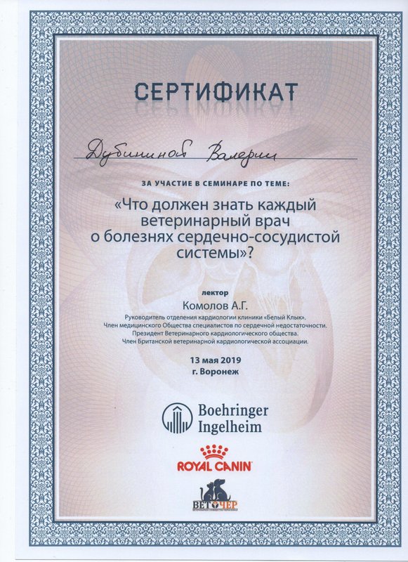 - 11.04.2024г. проходила курс «эхокардиография собак и кошек» под руководством к.в.н., кардиолога и специалиста УЗД, руководителя отделения кардиологии СВК «Свой Доктор» и ИВЦ МВА Вереникиной С.Н.