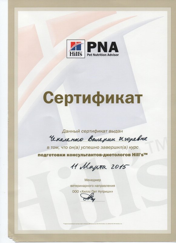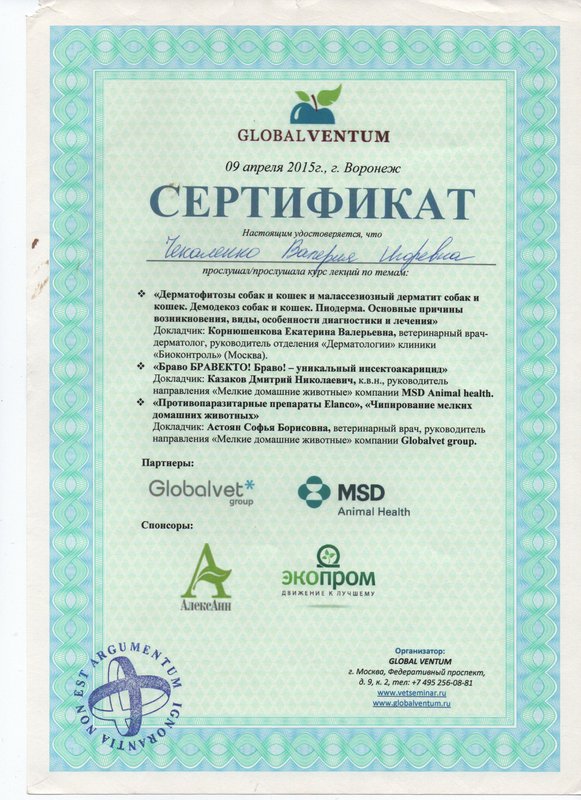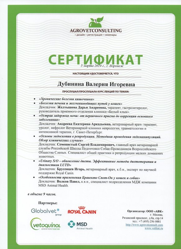 - 09.06.2022г. успешно усвоила программу мастер-класса «клинические случаи пациентов с разными типами хронической энтеропатии» под руководством ветеринарного врача-гастроэнтеролога, руководителя лечебно-диагностического отделения Ветеринарного Госпиталя СколковоВет Федотовой Д.А.,