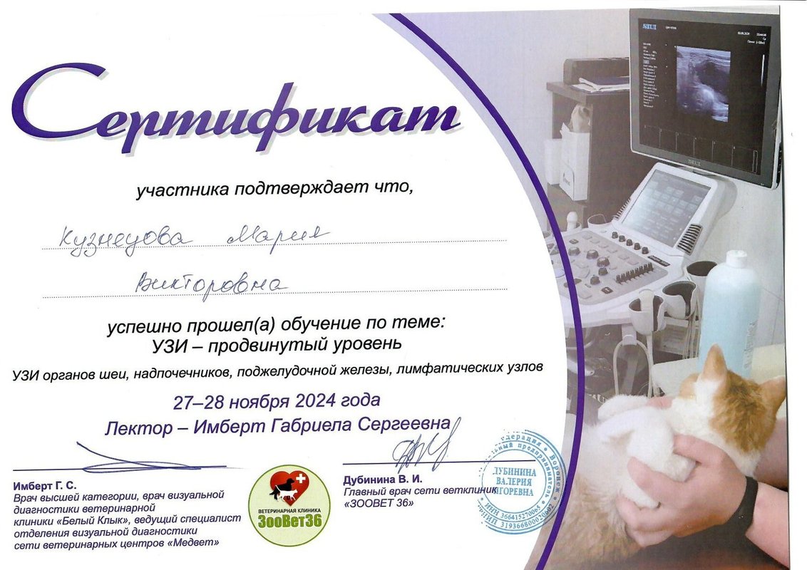 - 18.11.2021г. прошла курс «ультразвуковая диагностика. Интенсив. Базовый курс» под руководством к.в.н., ветеринарного врача, эксперта УЗД, руководителя отделения УЗД ИВЦ МВА Дунаевой Е.П., руководителя терапевтического отделения ИВЦ МВА, ветеринарного врача-эксперта УЗД Ветер Д.С., руководителя отделения репродуктологии ИВЦ МВА, ветеринарного врача-репродуктолога, эксперта УЗД Алферовой В.Д., ветеринарного врача, эксперта УЗД Касаткиной И.В.
